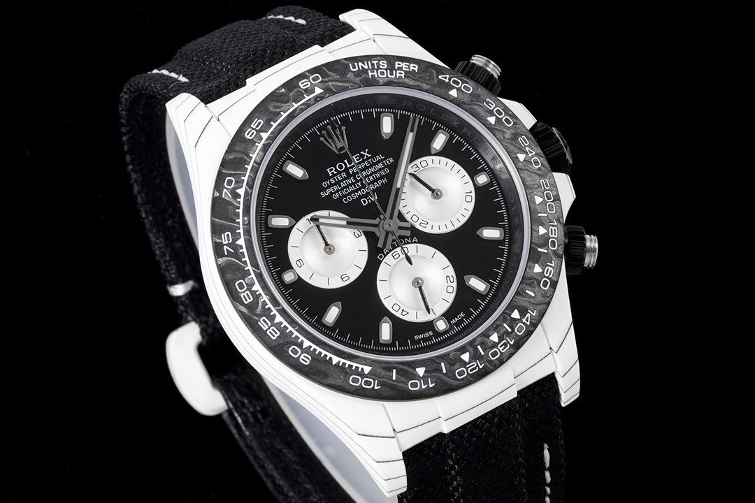 The Dew Collection Premium Super Carbon Fiber Customized Edition Cosmic Chronograph Daytona is a high-end watch that is made with premium materials and features a unique design. It is powered by a Swiss automatic movement and has a 44mm case made of carbon fiber. The dial is black with white accents and features a chronograph function. The watch also has a date window and a water resistance of 50 meters.