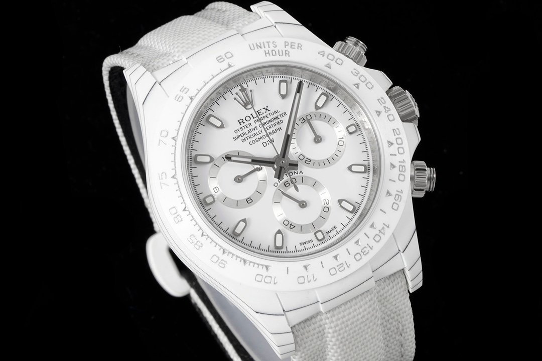 The Dew Collection Premium Super Carbon Fiber Customized Edition Cosmic Chronograph Daytona is a high-end watch that is made with premium materials and features a unique design. It is powered by a Swiss automatic movement and has a 44mm case made of carbon fiber. The dial is black with white accents and features a chronograph function. The watch also has a date window and a water resistance of 50 meters.