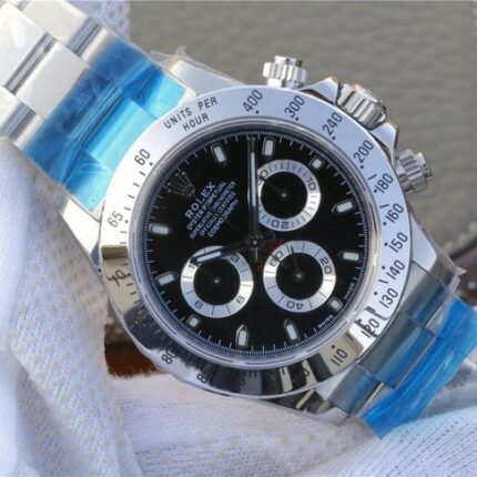 The Dew Collection Premium Super Carbon Fiber Customized Edition Cosmic Chronograph Daytona is a high-end watch that is made with premium materials and features a unique design. It is powered by a Swiss automatic movement and has a 44mm case made of carbon fiber. The dial is black with white accents and features a chronograph function. The watch also has a date window and a water resistance of 50 meters.