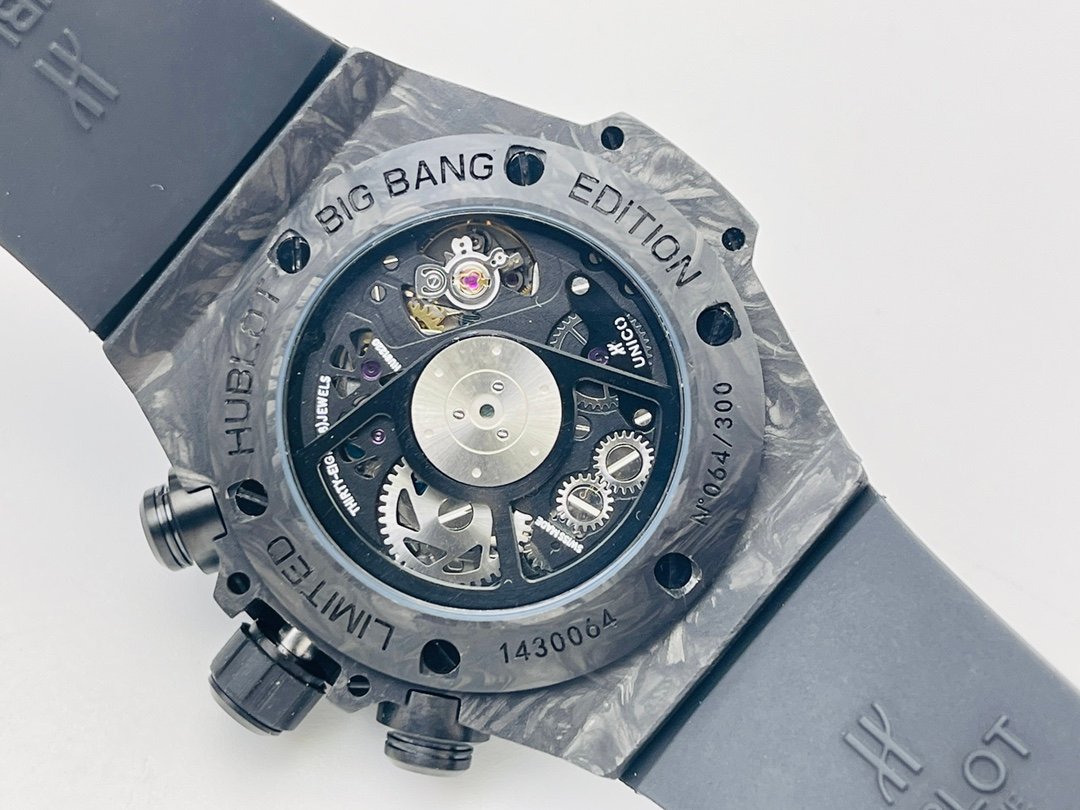 The new model follows the big bang series and is made of special carbon fiber materials. Yubo watch is equipped with 7750 modified "hub1242" automatic movement, which can be clearly seen through the watch case, and the beauty of extraordinary mechanical structure can be seen at a glance.Big bang series carbon fiber wristwatch adopts bold red, blue and black, showing an amazing strong visual impact effect. The internal precision mechanical structure is clearly presented through the watch case. The design of pointer and hour scale makes the whole surface send out a strong sense of rhythm and architecture, showing the extraordinary charm of time. The watch is equipped with a 30 minute timing dial at 3 o'clock and a second hand dial at 9 o'clock, which echoes the logo of Hublot Yubo watch at 12 o'clock.Watch with black structured rubber strap. In addition, the watch is equipped with a "one button" quick strap change system. The wearer can easily and quickly replace the strap with one click!!!p