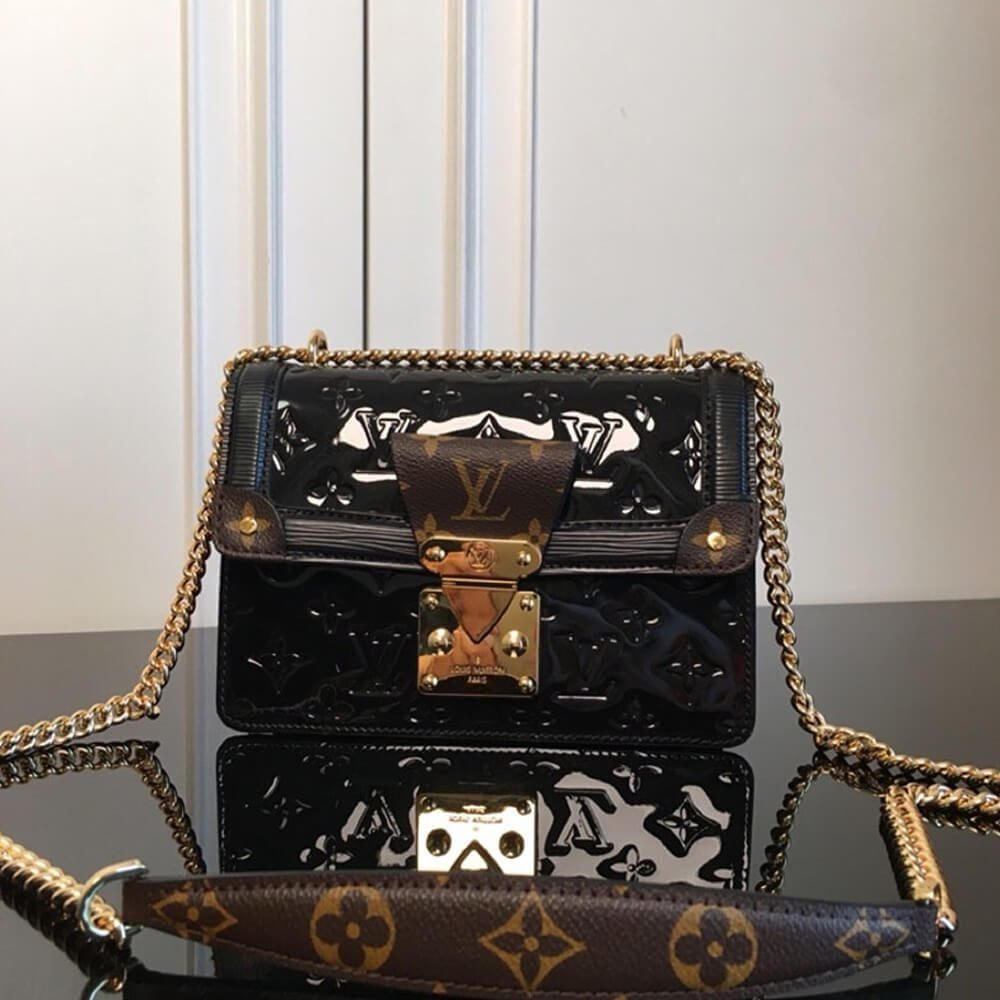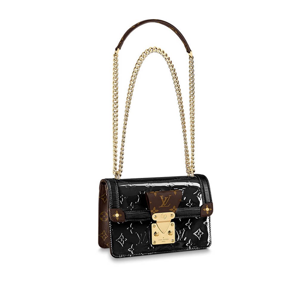 The LV Wynwood chain bag unites three emblematic House materials: glossy, glamorous Monogram Vernis patent leather, textured Epi leather and Monogram canvas. The result is a modern classic, an essential piece for an elegant woman??s handbag collection. It is accented with a substantial golden S-lock and a long sliding chain that adapts to shoulder or cross-body wear.
