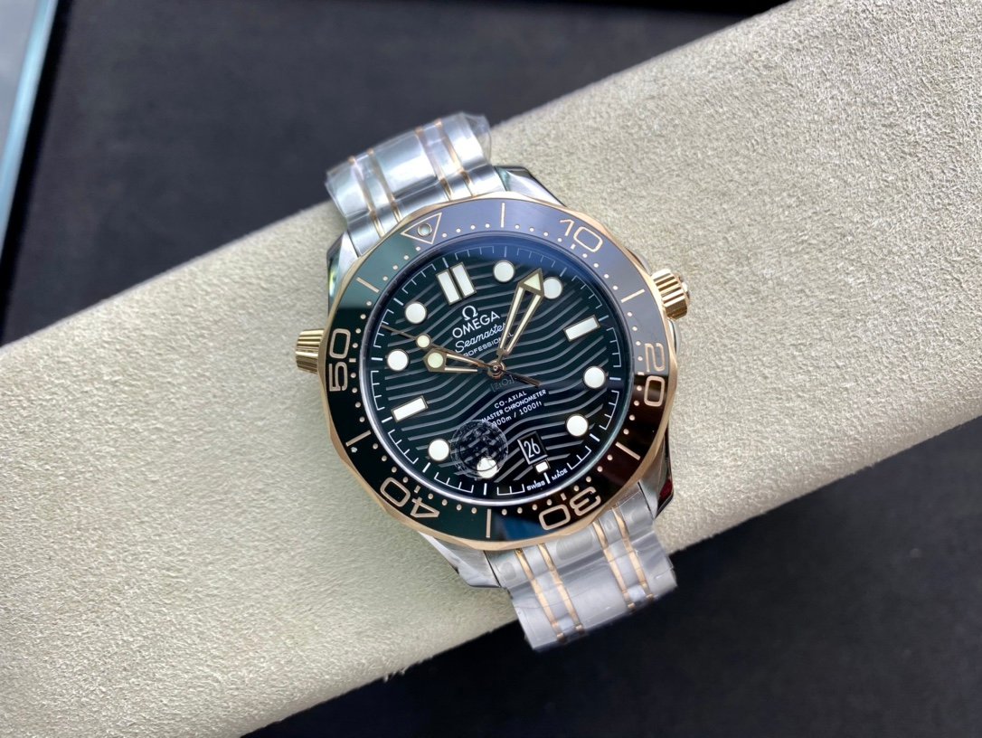 OMEGA Seamaster Diver 300M 42mm Black Dial is a high-quality Superclone watch that is very close to the original. It has a 42mm stainless steel case, a gold ceramic bezel, a black dial with wave pattern, and a date window at 6 o'clock. The watch is powered by a Swiss Eta automatic movement that is decorated to look like the Omega Co-Axial Master Chronometer movement. The watch also has a sapphire crystal and a water resistance of 300 meters.