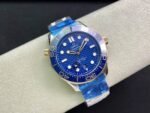 OMEGA Seamaster Diver 300M 42mm Blue Dial is a high-quality Superclone watch that is very close to the original. It has a 42mm stainless steel case, a blue ceramic bezel, a silver dial with wave pattern, and a date window at 6 o'clock. The watch is powered by a Swiss Eta automatic movement that is decorated to look like the Omega Co-Axial Master Chronometer movement. The watch also has a sapphire crystal and a water resistance of 300 meters.