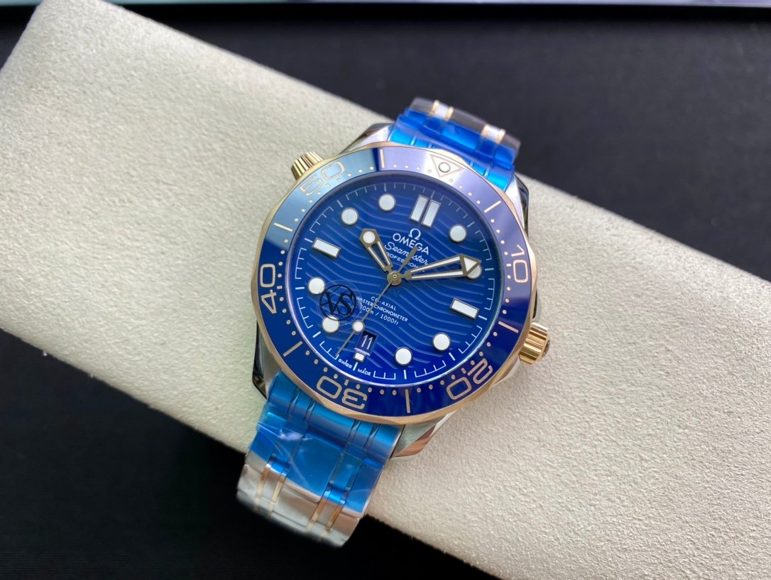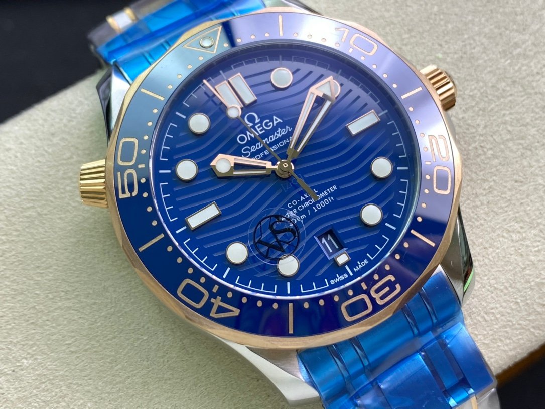 OMEGA Seamaster Diver 300M 42mm Blue Dial is a high-quality Superclone watch that is very close to the original. It has a 42mm stainless steel case, a blue ceramic bezel, a silver dial with wave pattern, and a date window at 6 o'clock. The watch is powered by a Swiss Eta automatic movement that is decorated to look like the Omega Co-Axial Master Chronometer movement. The watch also has a sapphire crystal and a water resistance of 300 meters.