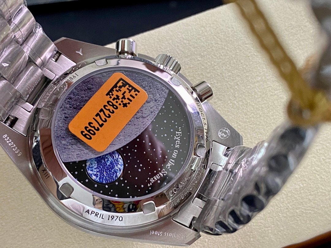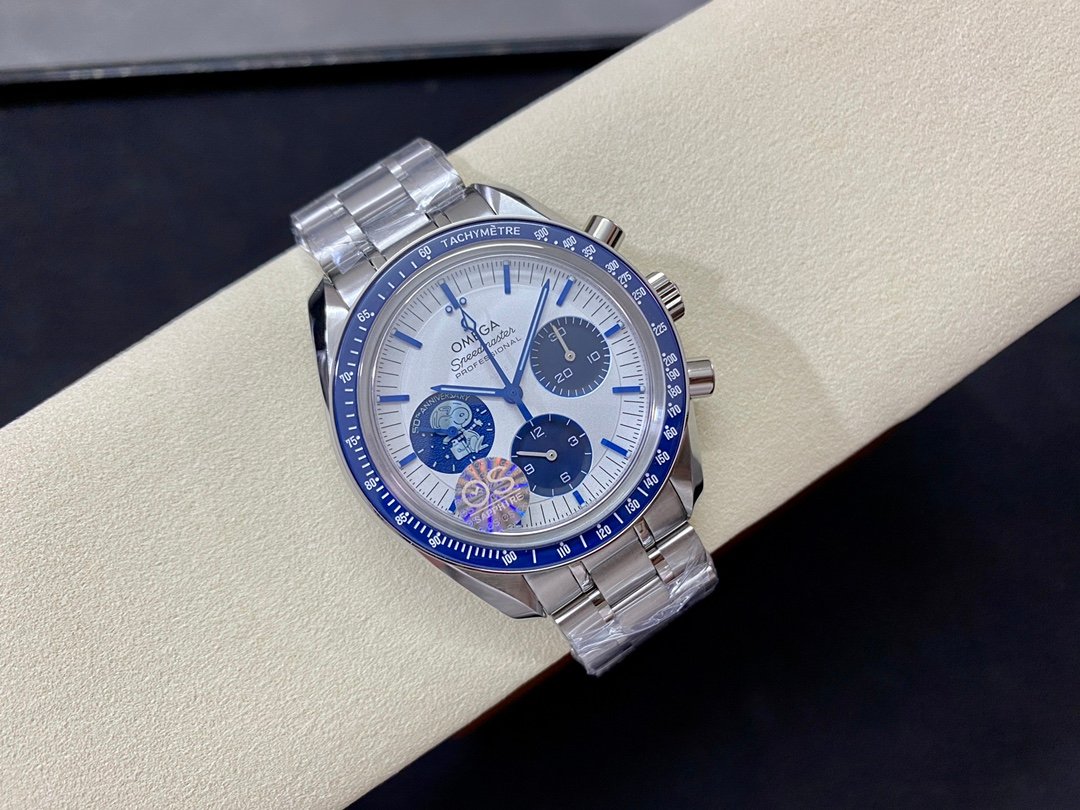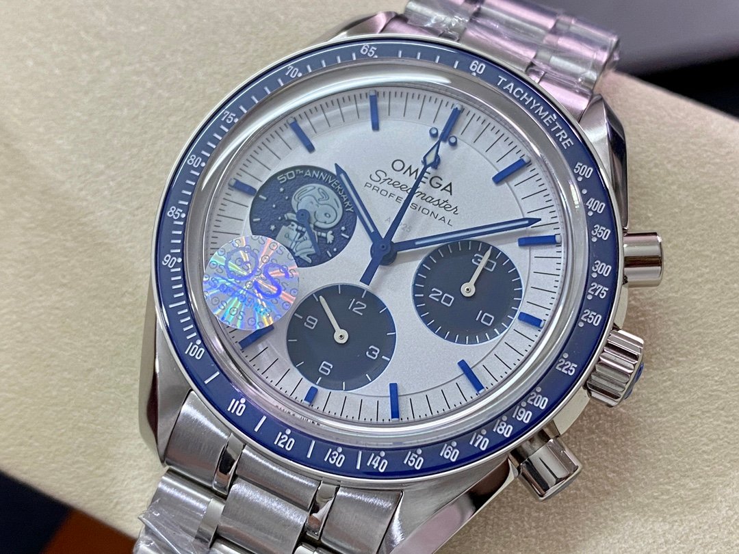 Omega Snoopy 150th Anniversary watch is a high-quality Superclone of the original Omega Speedmaster Silver Snoopy Award 50th Anniversary watch. It features a 42mm stainless steel case with a black ceramic bezel and a Hesalite crystal. The dial is black with a silver Snoopy logo and a moon phase display. The watch is powered by the VS Factory 3861 automatic movement, which is a clone of the original Omega Co-Axial Master Chronometer caliber 3861.