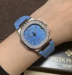 表壳整圈镶嵌46颗1.8克真钻💎,约0.73克拉。 百达翡丽梧桐,钢表之王! 这款鹦鹉螺女不仅拥有男款的优雅运动风格,还赋予了几分女性气质,让手表女士更加个性。 也是目前最受欢迎的PP女表之一!